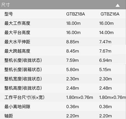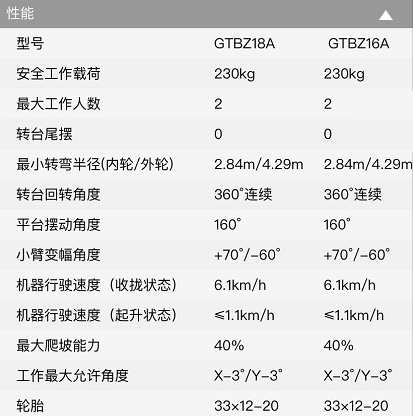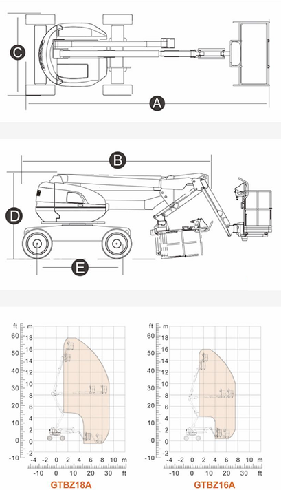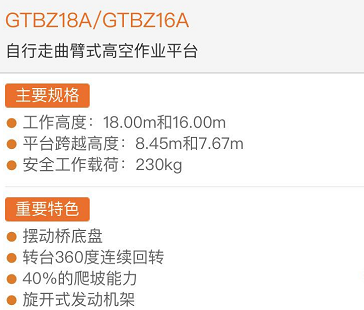 GTBZ18A/GTBZ16A自行走曲臂式高空作業(yè)平臺主要規(guī)格● 工作高度:18.00m和16.00m● 平臺跨越高度:8.45m和7.67m● 安全工作載荷:230kg重要特色● 擺動橋底盤● 轉(zhuǎn)臺360度連續(xù)回轉(zhuǎn)● 40%的爬坡能力● 旋開式發(fā)動機架